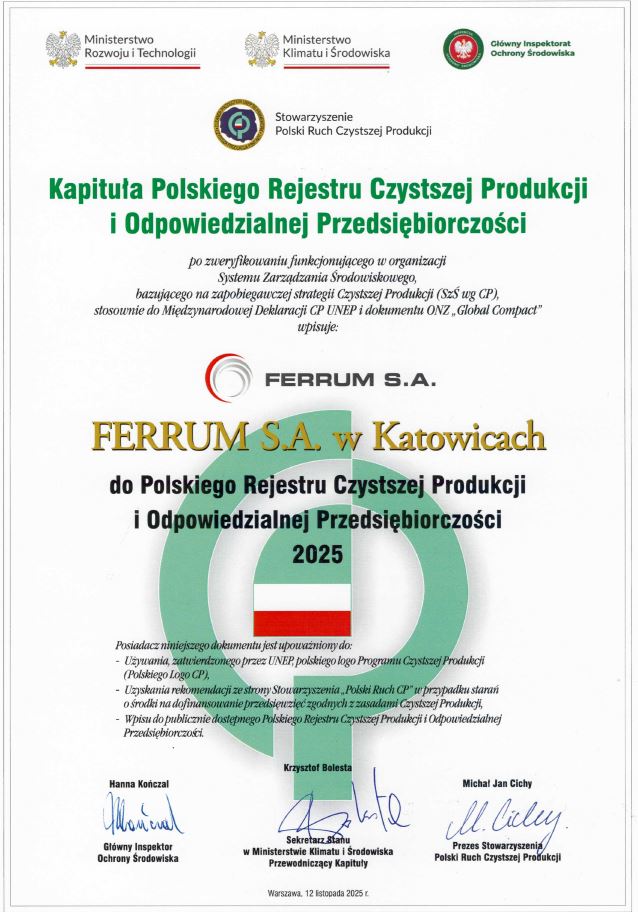 Wpis FERRUM S.A. do Polskiego Rejestru Czystszej Produkcji i Odpowiedzialnej Przedsiębiorczości.